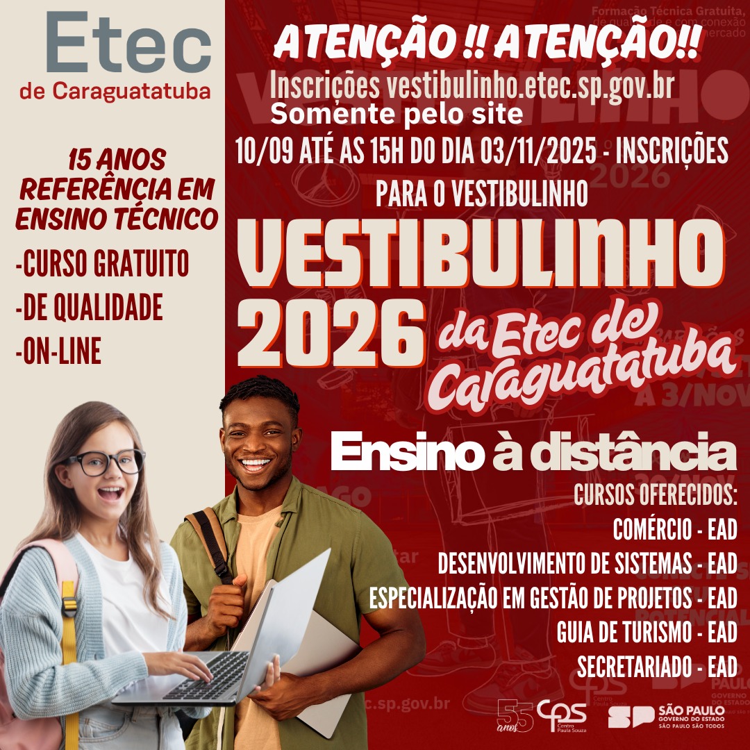 De 10/09 até as 15h do dia 03/11/2025 Inscrições para o Processo Seletivo (vestibulinho.etec.sp.gov.br) – Valor da taxa R$29,00